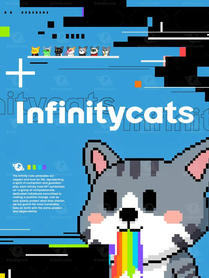 Infinity Cats 的核心使命是通过猫咪主题的数字艺术作品,连接全球收藏家、投资者和动物爱好者,推动动物救助和保护事业的发展。我们致力于在未来三年内,成为全球最具影响力的猫主题 NFT 品牌之一,同时与公益机构合作,积极参与动物救助和保护活动。Infinity Cats NFT 旨在拯救因自然或人为因素而陷入困境的动物。我们希望通过区块链技术为公益事业赋能,助力解决现实中的动物保护问题。